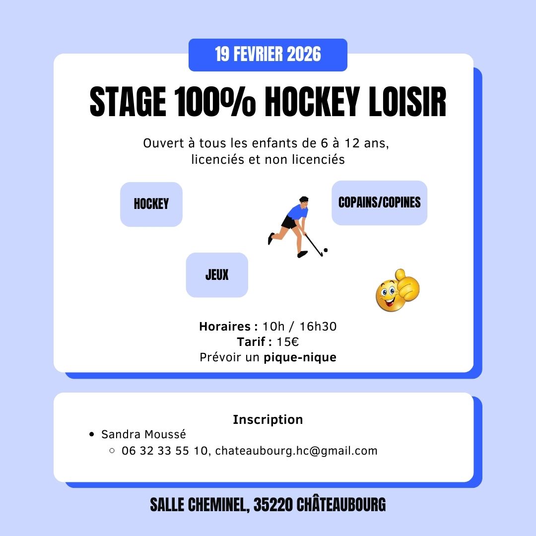 Pendant les prochaines vacances, le Châteaubourg Hockey Club propose un stage de hockey loisir le jeudi 19 février de 10h à 16h30 dans la salle Cheminel.